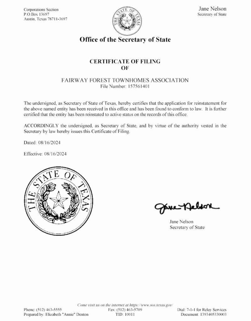 Reinstatement of Fairway Forest Townhomes Association is Complete!